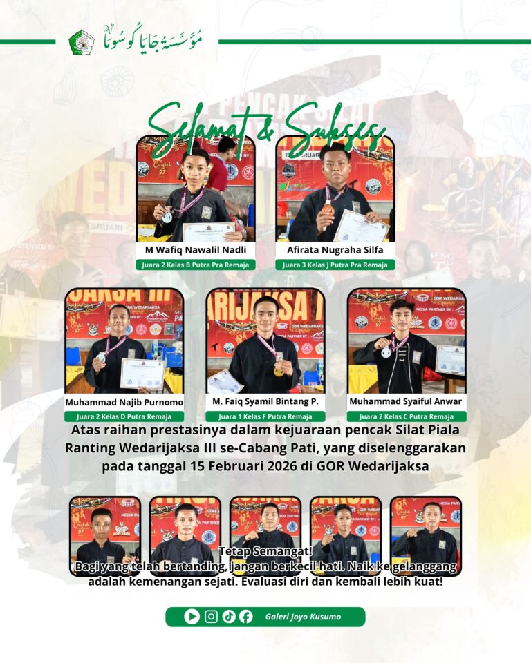 PATI – GOR Wedarijaksa menjadi saksi bisu ketangguhan para pendekar muda dari MTs-SMA Joyo Kusumo. Dalam ajang bergengsi Kejuaraan Pencak Silat Piala Ranting Wedarijaksa III